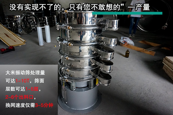 大米振動篩處理量可達1-10T,篩面層數可達1-5層,由于大米每次產出量較大,特意設計2-6個出料口,換網速度僅需3-5分鐘,提高效率,不影響大米正常產出量