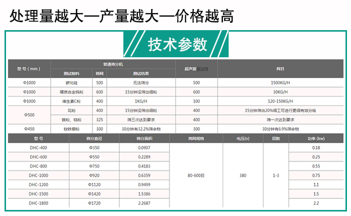 花粉超聲波振動篩價格差異大的一大因素就是因為產量的差異非常大,產量越高,篩分的物料就越多,帶來的經濟效益就越多,價格就越高。具體的參數如上圖所示。
