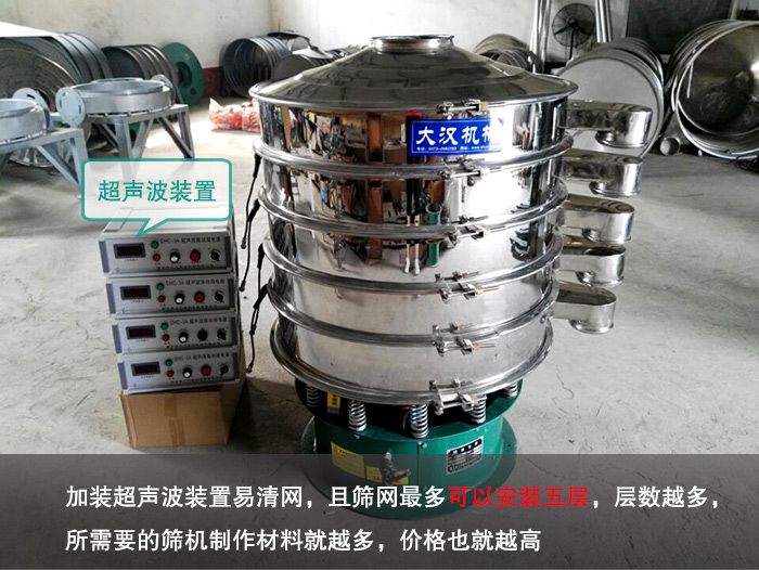 超聲波振動篩的篩網可以采用多層設計,由于是在傳統旋振篩基礎上加裝了一個超聲波篩分系統,所以結構也極其相似,篩網多可以安裝五層,篩分出多種不同規格物料,層數越多,所需要的篩機制作材料就越多,價格也就越高。