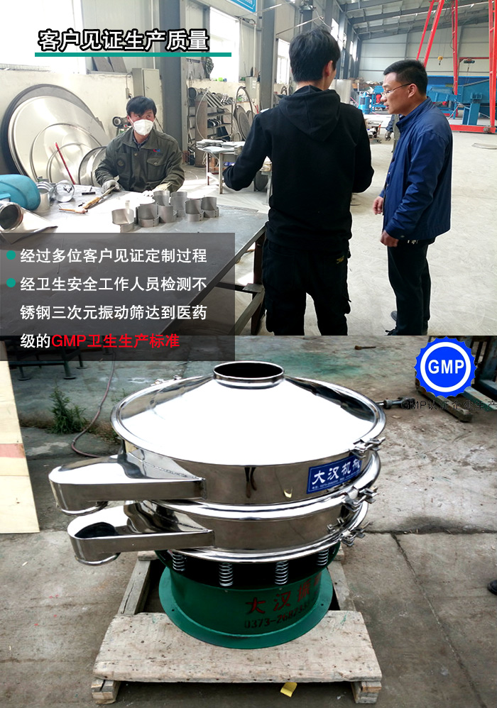 大漢機械公司成立已有快30余年,生產經驗算是十分豐富的了,畢竟是老牌子了,生產的振動篩不僅經過重重檢驗,且經過多位客戶見證定制過程,并且經衛生安全工作人員檢測不銹鋼三次元振動篩達到醫藥的衛生生產標準,對于食品行業的篩分非常的高效安全。