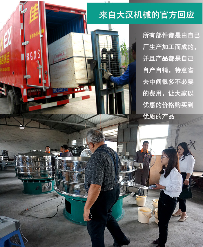 價格是除了質量以外,我們在選購時需要考慮的另外一個重要因素,我們都希望可以買到質優價廉的產品。大漢機械曾做出官方回應:“因為了解到這些情況,大漢機械生產的不銹鋼三次元振動篩所有部件都是由自己廠生產加工而成的,并且產品都是自己自產自銷,特意省去中間很多不必要的費用,讓大家以優惠的價格購買到優質的產品。”