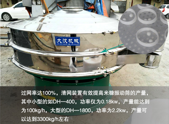 米糠振動篩篩網清理裝置把堵網率降到低過網率達100%,清網裝置有效提高米糠振動篩的產量,其中小型的如DH—400,功率僅為0.18kw,產量能達到為100kg/h,大型的DH—1800,功率為2.2kw,產量可以達到3300kg/h左右,篩分產量比較大