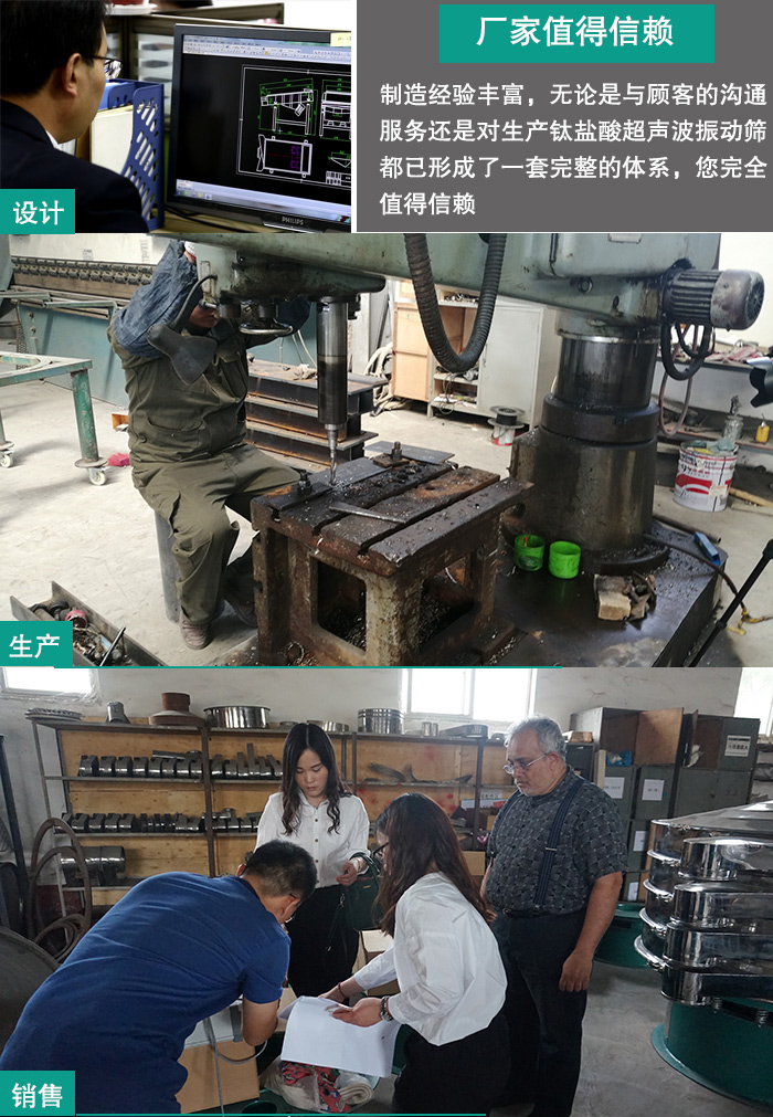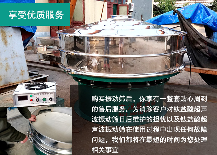 大漢廠家歷來以每一位客戶的滿意度為一要素,您購買振動篩后,你就可以享有一整套貼心周到的售后服務。為消除客戶對鈦鹽酸超聲波振動篩日后維護的擔憂以及鈦鹽酸超聲波振動篩在使用過程中出現故障問題,我們都將在短的時間為您處理相關事宜,包您買的放心,用著舒心。