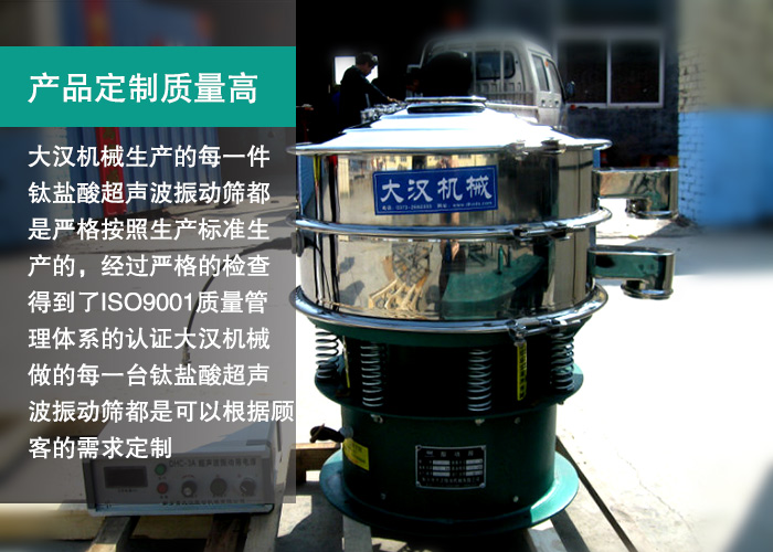 大漢機械生產的每一件鈦鹽酸超聲波振動篩都是嚴格按照生產標準生產的,經過嚴格的檢查得到了ISO9001質量管理體系的認證。所以,廣大消費者可以放心購買,放心使用,大漢機械做的每一臺鈦鹽酸超聲波振動篩都是可以根據顧客的需求定制的,所以不用擔心你買的超聲波振動篩不是你想要的那種質量的振動篩