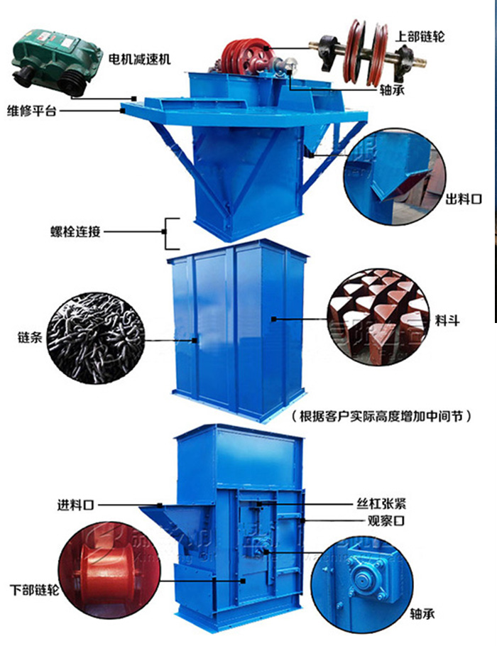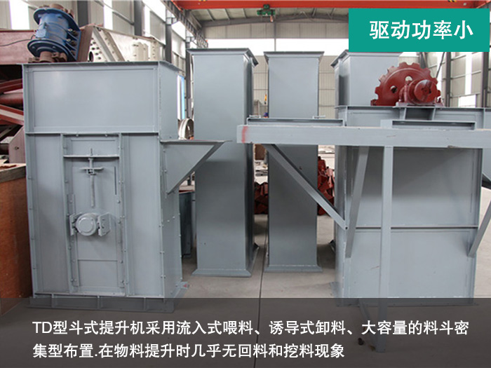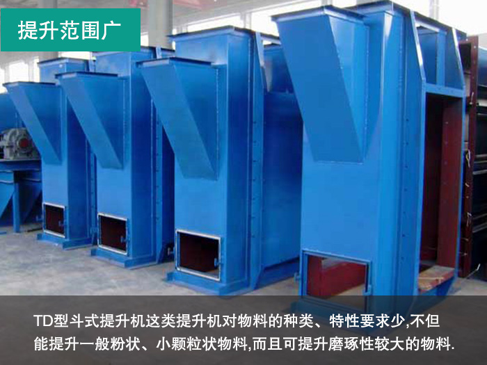 TD型斗式提升機這類提升機對物料的種類、特性要求少,不但能提升一般粉狀、小顆粒狀物料,而且可提升磨琢性較大的物料.密封性好,環境污染少。
