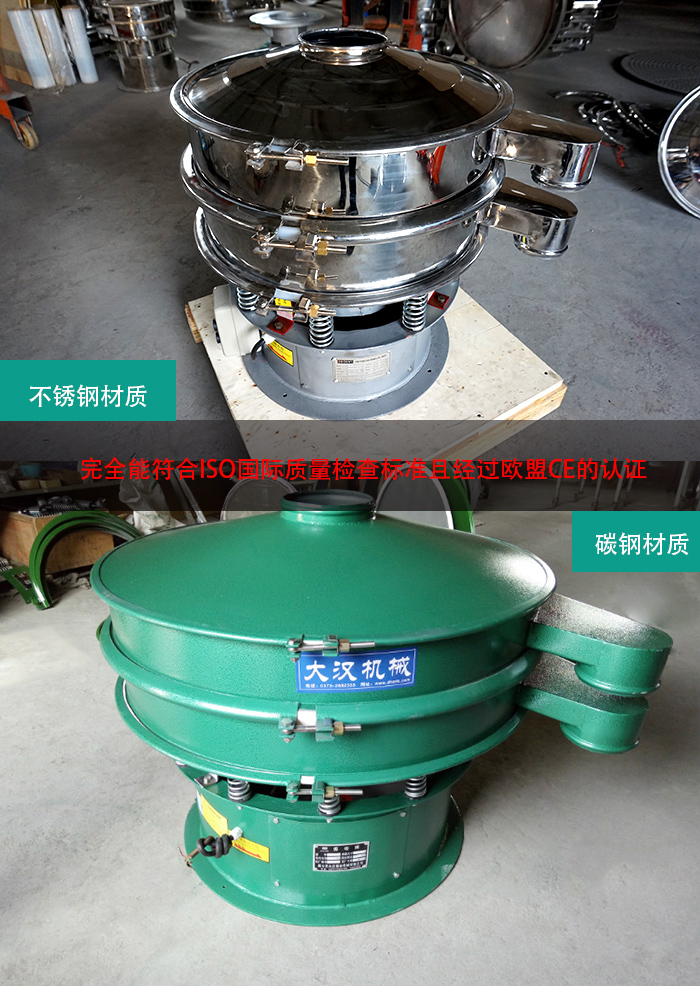 不同材質使用情況也是不一樣的,不銹鋼旋振篩一般用在耐腐蝕,耐氧化的物料之上,而碳鋼材質則是大多用戶的選著對象,因為不銹鋼旋振篩與碳鋼材質的旋振篩相比價格更高一點
