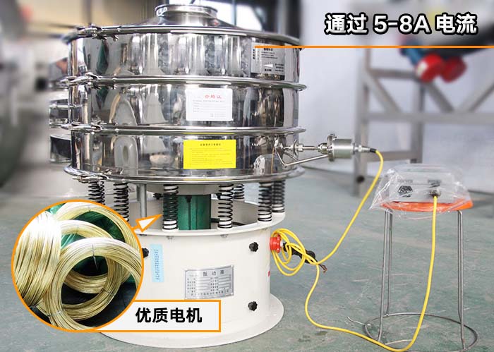 ①優(yōu)質(zhì)的振動篩配備的振動電機都是利用優(yōu)質(zhì)全銅線組成繞組材料,單位面積的通過電流量是每平方毫米能通過5-8A電流。電流量大決定了篩分量的大小