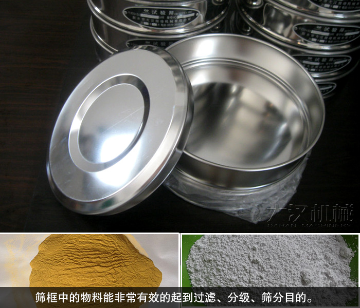 標(biāo)準(zhǔn)藥典篩和試驗(yàn)篩機(jī)配合使用,將篩子按孔徑大小疊在一起,給料放在頂上一層篩子上,并加上蓋和底盤,一般疊5~6個(gè)篩子。然后放在試驗(yàn)篩機(jī)上進(jìn)行機(jī)械振動(dòng)篩分。然后由需要檢測目數(shù)的篩框把小于篩網(wǎng)孔徑的物料顆粒篩分至下層篩框,如此層層篩選,使每層試驗(yàn)篩內(nèi)只留相同粒度的物料,達(dá)到不同粒度的分離并確定此物料的粒度組成,使篩框中的物料能非常有效的起到過濾、分級(jí)、篩分目的。