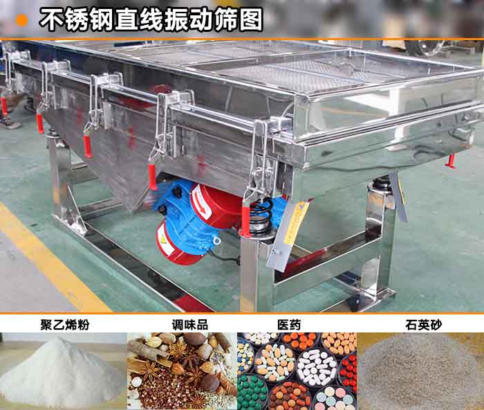 不銹鋼直線振動篩是在一般直線振動篩的基礎上將材質改為不銹鋼材料,非常實用于化工、食品、醫藥等行業,具有一定的耐腐蝕性。篩分精度高、處理量大、結構簡單、耗能少、噪音低、篩網使用壽命長、密封性好、極少粉塵溢散、維修方便