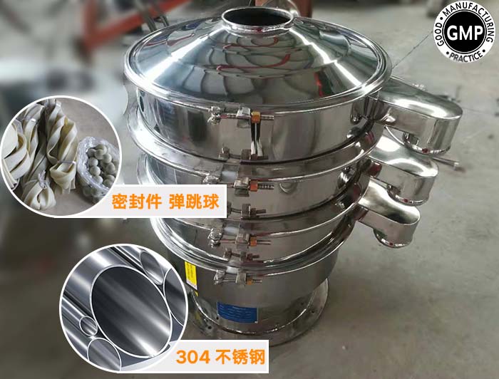 衛生級標準不銹鋼旋振篩采用304不銹鋼材質制作而成,底桶為不銹鋼材質,彈簧外圍加不銹鋼防護罩,密封件及擋球環彈跳球采用醫藥硅膠材質,且不銹鋼材質經過打磨,里外拋光后不僅外表靚麗,易清洗,且能夠符合醫藥行業的衛生要求。