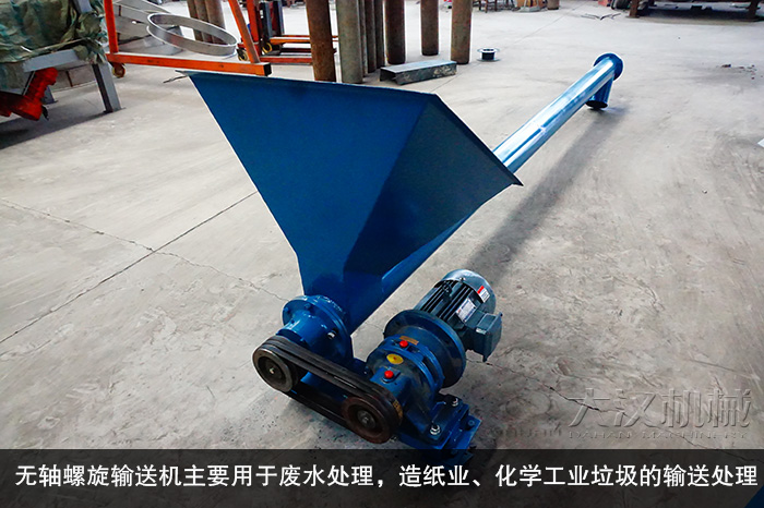 無軸螺旋輸送機又稱防纏繞輸送機、垃圾處理輸送機。采用無中心軸設計,利用具有一定柔性的整體鋼制螺旋推送物料,解決了傳統有軸螺旋輸送機和皮帶輸送機不能或不易輸送的物料,如顆粒狀和粉狀物料、濕的和糊狀物料、半流體和粘性物料、易纏繞和易堵塞物料、有特殊衛生要求的物料。無軸螺旋輸送機主要用于廢水處理,造紙業、化學工業垃圾的輸送處理。