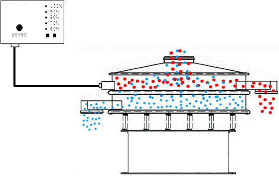 旋振篩,由直立式電機(jī)作激振源,電機(jī)上、下兩端安裝有偏心重錘,將電機(jī)的旋轉(zhuǎn)運(yùn)動(dòng)轉(zhuǎn)變?yōu)樗健⒋怪薄A斜的三次元運(yùn)動(dòng),再把這個(gè)運(yùn)動(dòng)傳遞給篩面,使物料在篩面上做定向踴躍式運(yùn)動(dòng)。其間,小于篩面孔徑的物料通過(guò)篩孔落到下層,成為篩下物,大于篩面孔徑的物料經(jīng)連續(xù)跳躍運(yùn)動(dòng)后從排料口排出,終完成篩分工作。實(shí)際運(yùn)用中,通過(guò)調(diào)整振動(dòng)電機(jī)上下兩端重錘的相位角,可改變物料在篩面上的運(yùn)動(dòng)軌跡,從而達(dá)到不同的篩分目的。