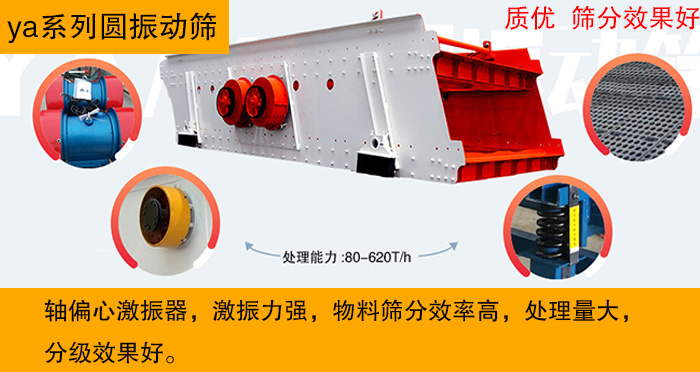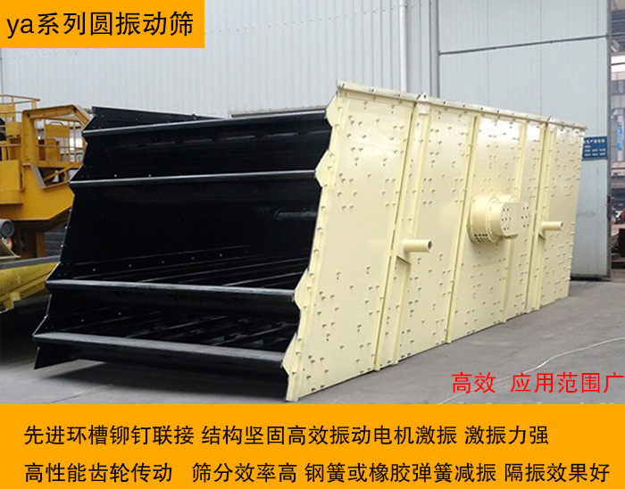 ya系列圓振動篩篩子橫梁與篩箱采用高強度螺栓,大傾角結構,堅固合理,質量超群。此外,ya系列圓振動篩采用軸偏心作激振器,激振力強,物料篩分效率高,分級效果好,處理量大。