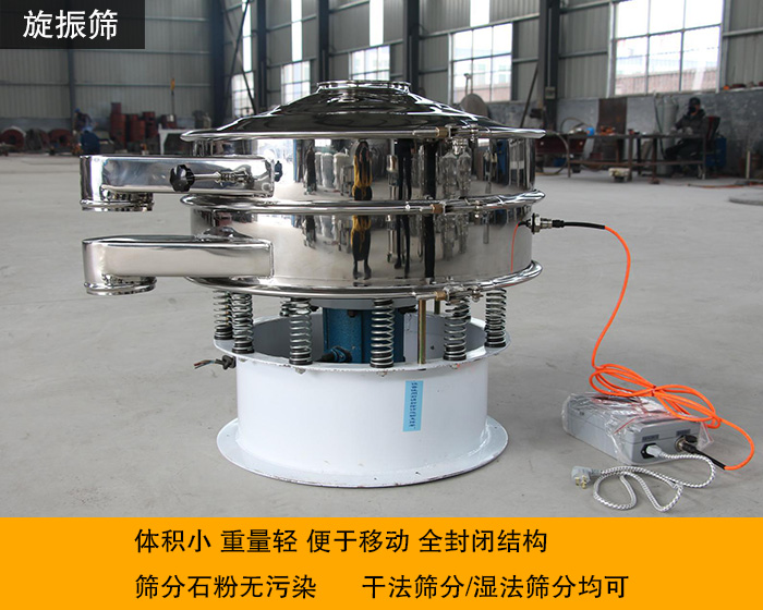 旋振篩體積小,安裝簡單,移動方便,篩網利用高,篩孔不堵塞,入料口與出料口方向可任意調整,全封閉結構,篩分石粉時無粉塵污染,干法篩分和濕法篩分均可,篩分效率極高。