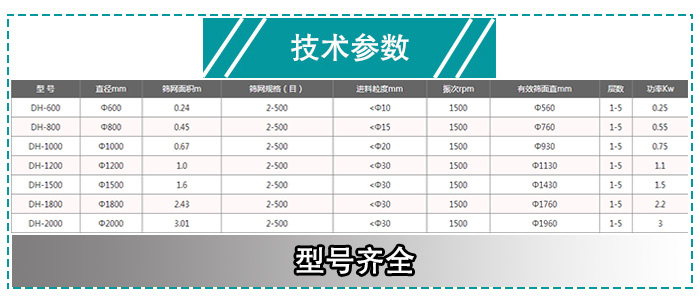 豌豆蛋白振動篩型號有:DHC-600、DHC-800、DHC-1000、DHC-1200、DHC-1500、DHC-1800、DHC-2000;型號多種多樣供您選擇