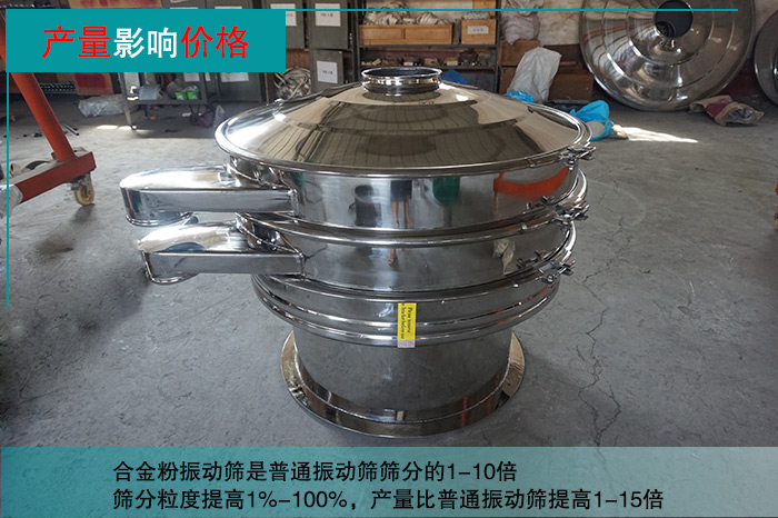合金粉振動篩是普通振動篩篩分的1-10倍,篩分產(chǎn)量較大,質(zhì)量高能篩分多種物料;篩分粒度提高1%-100%,產(chǎn)量比普通振動篩提高1-15倍,產(chǎn)量越高,消耗能量越高,機型配置也越高,價格也會越高
