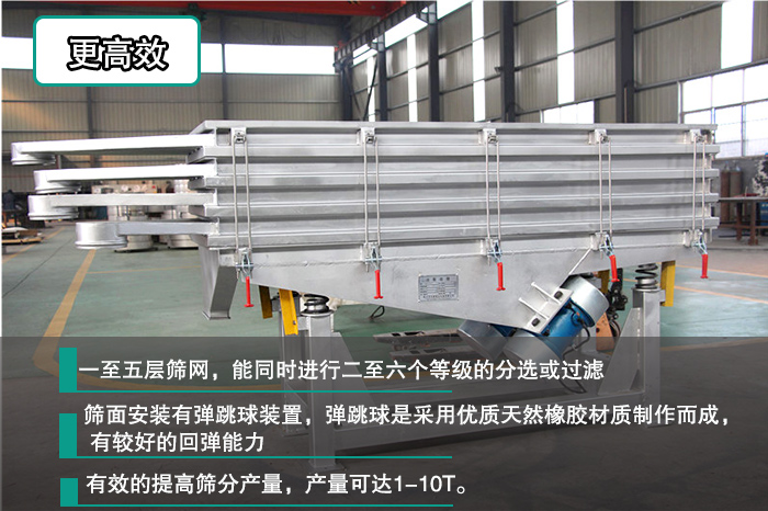 不銹鋼振動(dòng)篩分級(jí)篩選,可篩一至五層篩網(wǎng),能同時(shí)進(jìn)行二至六個(gè)等級(jí)的分選或過(guò)濾,篩面安裝有彈跳球裝置,彈跳球是采用優(yōu)質(zhì)天然橡膠材質(zhì)制作而成,有較好的回彈能力。根據(jù)回彈原理,應(yīng)用到振動(dòng)篩里,利用不銹鋼振動(dòng)篩振動(dòng)電機(jī)的強(qiáng)迫式振動(dòng)中藥粉,迫使彈跳球做上下彈跳,來(lái)不斷的擊打篩網(wǎng),達(dá)到清理篩網(wǎng)的目的,有效的提高篩分產(chǎn)量,產(chǎn)量可達(dá)1-10T。