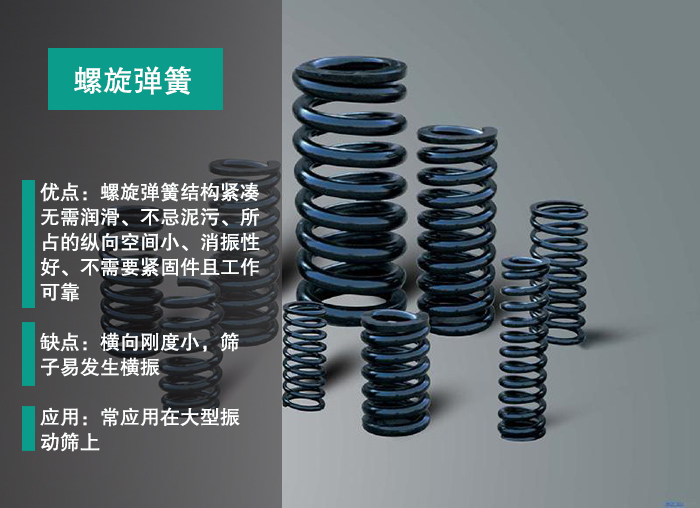 減振彈簧是振動篩中的一個必不可少的零部件。振動篩上的減振彈簧是連接篩體和底座的重要部分,在振動篩工作的過程中起到緩沖的作用,使物料可以在篩網(wǎng)上保持向前運動而不損傷振動篩。你了解的隔振彈簧有哪些呢?