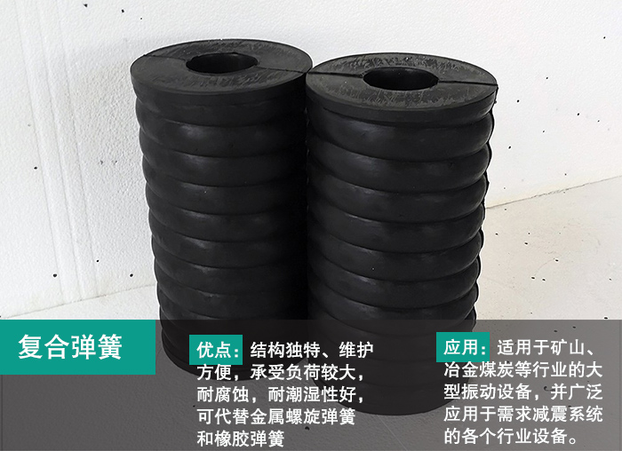 復(fù)合彈簧集金屬螺旋彈簧與橡膠彈簧的優(yōu)點于一身形狀和機械性能穩(wěn)定,能承受載荷與大變形量,隔振降噪效果好,工作平穩(wěn)共振區(qū)時間短