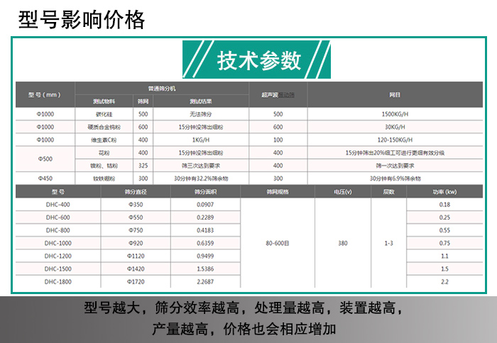 超聲波振動(dòng)篩有DHC-400、DHC-600、DHC-800、DHC-1000、DHC-1200、DHC-1500、DHC-1800,型號(hào)多樣,型號(hào)越大,篩分效率越高,處理量越高,裝置越大,產(chǎn)量越高,因此會(huì)影響價(jià)格