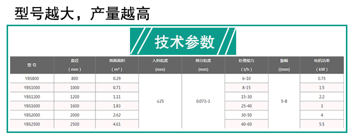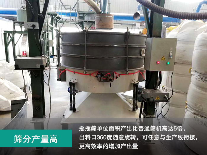 搖擺篩設備可以做成單層也可做成多層,型號從600mm-3200mm不等,型號不同處理量不同,型號越大篩分效率越高,篩機處理量越大;搖擺篩單位面積產出比普通篩機高達5倍,出料口360度隨意旋轉,可任意與生產線銜接,更高效率的增加產出量
