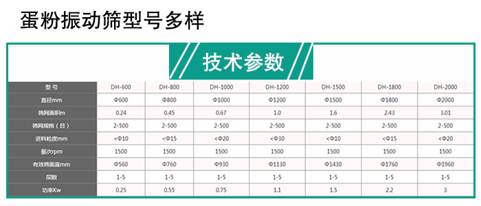大漢機械蛋糕粉振動篩型號多樣,小至DH-600,大至DH-2000,每一種型號的選擇對應的效率,進料粒度是不同的,因此篩分蛋糕粉產量也是不同的,具體可查看蛋糕粉振動篩技術參數表