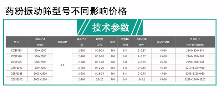 藥粉振動篩型號有DZSF515、DZSF520、DZSF525、DZSF1020、DZSF1025、DZSF1030的類型,對于不同型號的藥粉振動篩,篩粉產量不同,價格自然也是不同的