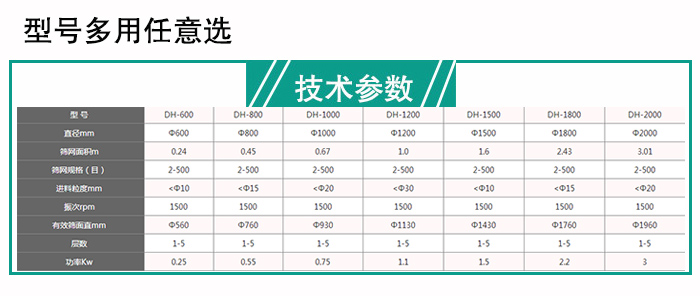 大漢機械藥粉振動篩型號小至DH-600、大至DH-2000,型號不同,效率不同,產量不同,詳細可參考藥粉振動篩型號參數表,我們能做的,就是給您更多的選擇,滿足您更多的需求